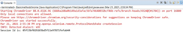 import org.openqa.selenium.WebDriver; import org.openqa.selenium.WebElement; import org.openqa.selenium.chrome.ChromeDriver; import java.util.concurrent.TimeUnit; import org.openqa.selenium.remote.SessionId; import org.openqa.selenium.remote.RemoteWebDriver; public class BrwSessionId{ public static void main(String[] args) { //set chromedriver.exe file path System.setProperty("webdriver.chrome.driver", "C:\Users\ghs6kor\Desktop\Java\chromedriver.exe"); WebDriver driver = new ChromeDriver(); //implicit wait driver.manage().timeouts().implicitlyWait(5, TimeUnit.SECONDS); //URL launch driver.get("https://tutorialspoint.tw/index.htm"); //get webdriver session id SessionId s = ((RemoteWebDriver) driver).getSessionId(); System.out.println("Session Id is: " + s); //browser close driver.quit(); } }