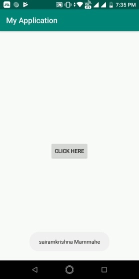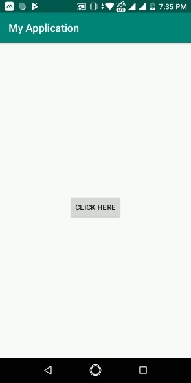 <?xml version = "1.0" encoding = "utf-8"?> <LinearLayout xmlns:android = "http://schemas.android.com/apk/res/android" xmlns:app = "http://schemas.android.com/apk/res-auto" xmlns:tools = "http://schemas.android.com/tools" android:layout_width = "match_parent" android:gravity = "center" android:layout_height = "match_parent" tools:context = ".MainActivity" android:orientation = "vertical"> <Button android:id = "@+id/parcleObject" android:layout_width = "wrap_content" android:layout_height = "wrap_content" android:layout_alignParentTop = "true" android:layout_centerHorizontal = "true" android:layout_marginTop = "27dp" android:text = "Click here"/> </LinearLayout>