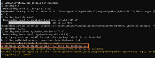 要獲得BeautifulSoup和Selenium,我們應該執行命令−