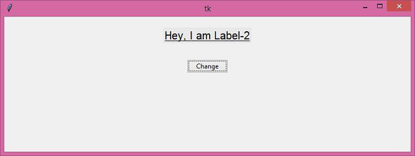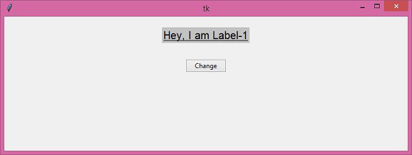 #Import necessary Library from tkinter import * from tkinter import ttk #Create an instance of tkinter window win= Tk() #Set the geometry of tkinter window win.geometry("750x250") #Define the function to change the value in label widget def change_text(label): label.configure(text= "Hey, I am Label-2", background="gray91") #Create a Label label = Label(win, text= "Hey, I am Label-1", font= ('Helvetica 15 underline'), background="gray76") label.pack(pady=20) #Create a button btn= ttk.Button(win, text= "Change", command= lambda:change_text(label)) btn.pack(pady=10) win.mainloop()