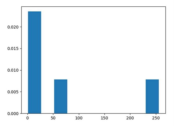 from matplotlib import pyplot as plt x = [1, 4, 16, 64, 256] # stacked and density are true then the sum of the histograms is normalized to 1. plt.hist(x, 10, stacked=True, density=True) plt.show()