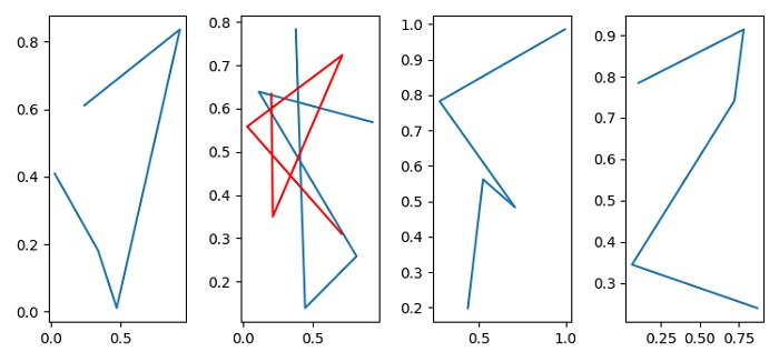 import numpy as np import matplotlib.pyplot as plt plt.rcParams["figure.figsize"] = [7.50, 3.50] plt.rcParams["figure.autolayout"] = True fig = plt.figure() for index in [1, 2, 3, 4]: ax = fig.add_subplot(1, 4, index) ax.plot(np.random.rand(5), np.random.rand(5)) ax = fig.add_subplot(1, 4, 2) ax.plot(np.random.rand(5), np.random.rand(5), color='red') plt.show()