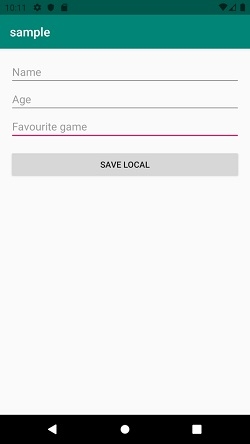 <?xml version="1.0" encoding="utf-8"?> <LinearLayout xmlns:android="http://schemas.android.com/apk/res/android" android:id="@+id/rlMain" android:layout_width="match_parent" android:layout_height="match_parent" android:layout_margin="16dp" android:orientation="vertical"> <EditText android:id="@+id/etName" android:layout_width="match_parent" android:layout_height="wrap_content" android:hint="Name" android:inputType="text" /> <EditText android:id="@+id/etAge" android:layout_width="match_parent" android:layout_height="wrap_content" android:hint="Age" android:inputType="number" /> <EditText android:id="@+id/etGame" android:layout_width="match_parent" android:layout_height="wrap_content" android:hint="Favourite game" android:inputType="text" /> <Button android:layout_width="match_parent" android:layout_height="wrap_content" android:layout_marginTop="16dp" android:onClick="saveLocal" android:text="save local" /> </LinearLayout>