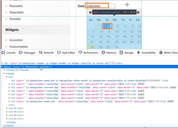 import org.openqa.selenium.WebDriver; import org.openqa.selenium.WebElement; import org.openqa.selenium.firefox.FirefoxDriver; import java.util.concurrent.TimeUnit; import org.openqa.selenium.By; import java.util.List; public class DtPicker{ public static void main(String[] args) { System.setProperty("webdriver.gecko.driver", "C:\Users\ghs6kor\Desktop\Java\geckodriver.exe"); WebDriver driver = new FirefoxDriver(); //implicit wait driver.manage().timeouts().implicitlyWait(5, TimeUnit.SECONDS); //URL launch driver.get("https://jqueryui.com/datepicker"); //switch to frame WebElement f = driver .findElement(By.xpath("//iframe[@class='demo-frame']")); driver.switchTo().frame(f); //identify element within frame WebElement l = driver.findElement(By.id("datepicker")); l.click(); //identify all td elements in list List<WebElement> t =driver.findElements(By.xpath("//table/tbody/tr/td")); //list traversal for (int k = 0; k<t.size(); k++) { //check date String dt = t.get(k).getText(); if (dt.equals("2")) { t.get(k).click(); break; } } //obtain selected date String v = l.getAttribute("value"); System.out.print("Date selected by date picker: "+ v); //close browser driver.close(); } }
