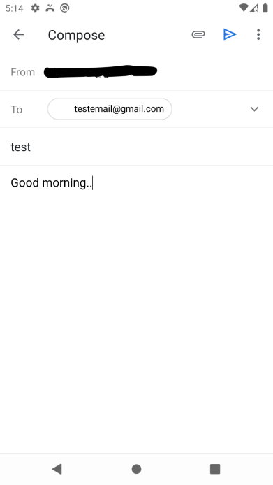 <?xml version="1.0" encoding="utf-8"?> <LinearLayout xmlns:android="http://schemas.android.com/apk/res/android" xmlns:tools="http://schemas.android.com/tools" android:layout_width="match_parent" android:layout_height="match_parent" android:orientation="vertical" android:padding="4dp" tools:context=".MainActivity"> <TextView android:layout_width="wrap_content" android:layout_height="wrap_content" android:text="Recipient email!" /> <EditText android:id="@+id/editTextMail" android:layout_width="match_parent" android:layout_height="wrap_content" /> <TextView android:layout_width="wrap_content" android:layout_height="wrap_content" android:text="Subject" /> <EditText android:id="@+id/editTextSubject" android:layout_width="match_parent" android:layout_height="wrap_content" /> <TextView android:layout_width="wrap_content" android:layout_height="wrap_content" android:text="Message" /> <EditText android:id="@+id/editTextMessage" android:layout_width="match_parent" android:layout_height="wrap_content" android:lines="4" /> <Button android:id="@+id/buttonSend" android:layout_width="match_parent" android:layout_height="wrap_content" android:text="Send" /> </LinearLayout>