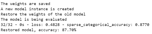 print("Restored model, accuracy: {:5.2f}%".format(100 * acc))程式碼來源 - https://www.tensorflow.org/tutorials/keras/save_and_load
