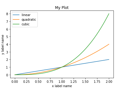 import matplotlib.pyplot as plt import numpy as np fig = plt.figure() x = np.linspace(0, 2, 100) fig, ax = plt.subplots() ax.plot(x, x, label='linear') ax.plot(x, x**2, label='quadratic') ax.plot(x, x**3, label='cubic') ax.set_xlabel('x label name') ax.set_ylabel('y label name') ax.set_title("My Plot") ax.legend()