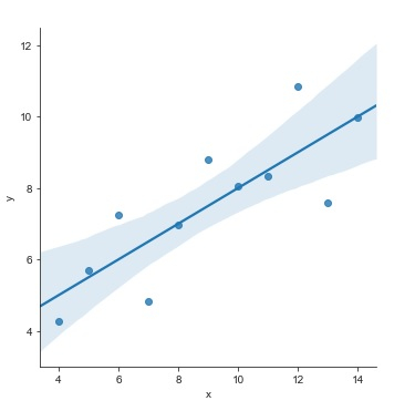 import pandas as pd import seaborn as sb from matplotlib import pyplot as plt my_df = sb.load_dataset('anscombe') sb.lmplot(x="x", y="y", data=my_df.query("dataset == 'I'")) plt.show()