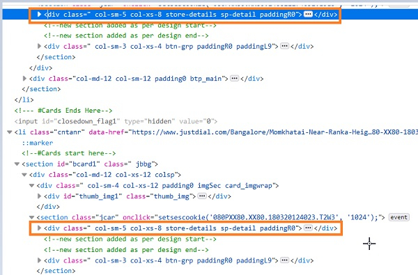 讓我們看看具有 div 標籤且 class 屬性設定了相同值的元素的 html 程式碼(如影像中突出顯示的那樣)。class 屬性的值為 - colsm-5 col-xs-8 store-details sp-detail paddingR0。