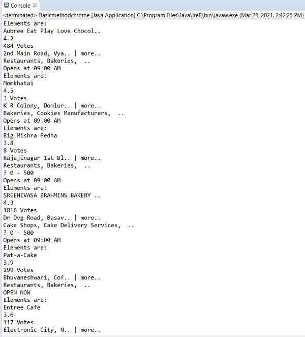 import org.openqa.selenium.By; import org.openqa.selenium.WebDriver; import org.openqa.selenium.WebElement; import org.openqa.selenium.chrome.ChromeDriver; import java.util.concurrent.TimeUnit; import java.util.List; public class DivSameCls{ public static void main(String[] args) { System.setProperty("webdriver.chrome.driver", "C:\Users\ghs6kor\Desktop\Java\chromedriver.exe"); WebDriver driver = new ChromeDriver(); //implicit wait driver.manage().timeouts().implicitlyWait(5, TimeUnit.SECONDS); //URL launch driver.get("https://www.justdial.com/Bangalore/Bakeries"); // identify div elements with same class List<WebElement> l = driver.findElements(By.className("store-details")); // list iteration System.out.println("Elements are: "); for(int j = 0; j< l.size(); j++) { //identify separate div String v = l.get(j).getText(); System.out.println("Elements are: "); System.out.println(v); } //browser close driver.close(); } }