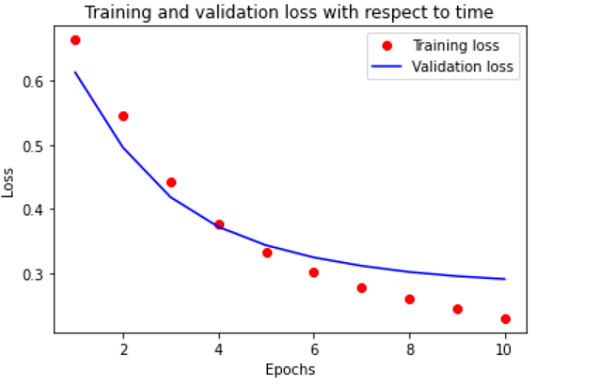 因此,“matplotlib”庫用於繪製訓練和驗證期間發生的損失關於時間的變化。