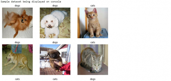 TensorFlow可以使用‘matplotlib’庫來顯示來自貓狗輸入資料集的樣本資料。“imshow”方法可以用來在控制檯上顯示影像。