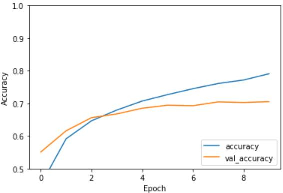 Plotting accuracy versus epoch The model is being evaluated 313/313 - 3s - loss: 0.8884 - accuracy: 0.7053 The accuracy of the model is: 0.705299973487854