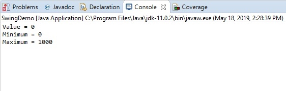 System.out.println("Maximum = "+progressBar.getMaximum());以下示例用於獲取進度條元件的值 −