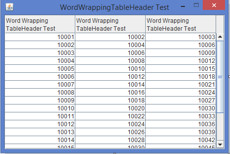 table.setModel(new DemoTableModel(Arrays.asList("Word Wrapping TableHeader Test", "Word Wrapping TableHeader Test", "Word Wrapping TableHeader Test"), 20));