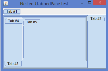 import java.awt.*; import java.awt.event.*; import javax.swing.*; import javax.swing.event.*; public class NestedJTabbedPaneTest extends JFrame { public NestedJTabbedPaneTest() { setTitle("Nested JTabbedPane test"); setLayout(new BorderLayout()); JTabbedPane tabbedPane = new JTabbedPane(); add(BorderLayout.CENTER, tabbedPane); createNestedTab(tabbedPane, 1); setSize(375, 250); setDefaultCloseOperation(JFrame.EXIT_ON_CLOSE); setLoc*ationRelativeTo(null); setVisible(true); } protected void createNestedTab(JTabbedPane jtp, int count) { if (count > 5) return; JTabbedPane tp = new JTabbedPane(); tp.setTabPlacement(getNextOrientation(jtp.getTabPlacement())); jtp.addTab("Tab #" + count, tp); createNestedTab(tp, count+1); } private int getNextOrientation(int tabPlacement) { if (tabPlacement == JTabbedPane.TOP) return JTabbedPane.RIGHT; if (tabPlacement == JTabbedPane.RIGHT) return JTabbedPane.BOTTOM; if (tabPlacement == JTabbedPane.BOTTOM) return JTabbedPane.LEFT; else return JTabbedPane.TOP; } public static void main(String []args) { new NestedJTabbedPaneTest(); } }