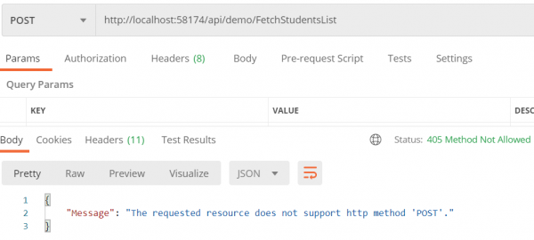 我們可以看到,當我們向FetchStudentsList動作方法傳送POST請求時,由於它用[HttpGet]屬性修飾,我們得到了**405 Method Not Allowed**響應。