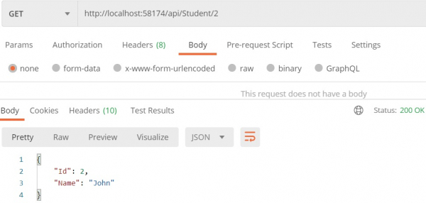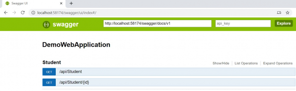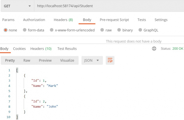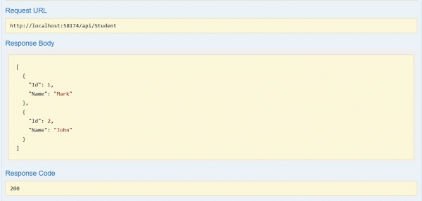 測試 WebApi 包括髮送請求和接收響應。有多種方法可以測試 WebApi。在這裡,我們將使用 postman 和 swagger 來測試 WebApi。讓我們像下面一樣建立一個 StudentController。