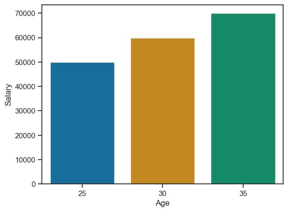 sns.barplot(x='Age', y='Salary', data=df)