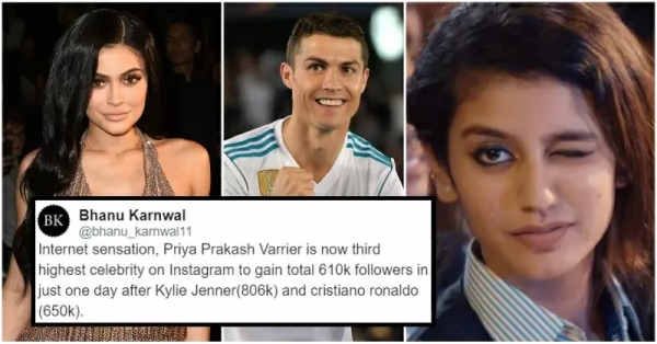 Priya Prakash Varrier 是來自特里舒爾維馬拉學院的商業學士學生,她是印度最快的躥紅名人,一夜之間獲得了一百萬粉絲,並且還在不斷增長。她在 Instagram 上一天就獲得了 610,000 名粉絲,這讓她成為第三位粉絲數量最多的名人。她獲得了“天使 Priya”和“國民甜心”兩個稱號,由網民加冕。除此之外,後來也出現了混合名人照片和影片的模因,也迅速走紅。
