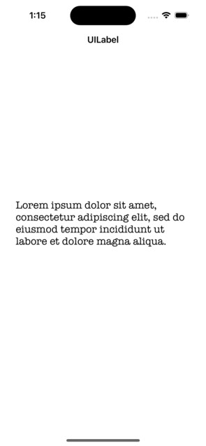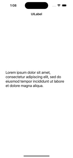 import UIKit class TestController: UIViewController { private let messageLabel = UILabel() override func viewDidLoad() { super.viewDidLoad() initialSetup() } private func initialSetup() { // basic setup view.backgroundColor = .white navigationItem.title = "UILabel" // label customization messageLabel.text = "Lorem ipsum dolor sit amet, consectetur adipiscing elit, sed do eiusmod tempor incididunt ut labore et dolore magna aliqua." messageLabel.numberOfLines = 0 // adding the constraints to label view.addSubview(messageLabel) messageLabel.translatesAutoresizingMaskIntoConstraints = false messageLabel.centerYAnchor.constraint(equalTo: view.centerYAnchor).isActive = true messageLabel.leadingAnchor.constraint(equalTo: view.leadingAnchor, constant: 30).isActive = true messageLabel.trailingAnchor.constraint(equalTo: view.trailingAnchor, constant: -30).isActive = true } }