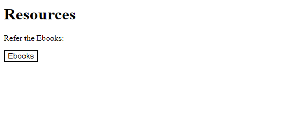 <!DOCTYPE html> <html> <head> <title>Button Link</title> <style> .mybtn { background-color: white; text-align: center; display: inline-block; font-size: 15px; cursor: pointer; } </style> </head> <body> <h1>Resources</h1> <p>Refer the Ebooks:</p> <form action="https://tutorialspoint.tw/latest/ebooks"> <button class = "mybtn" type="submit"> Ebooks </button> </form> </body>