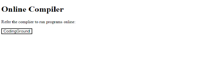 <!DOCTYPE html> <html> <head> <title>Button Link</title> <style> .mybtn { background-color: white; text-align: center; display: inline-block; font-size: 15px; cursor: pointer; } </style> </head> <body> <h1>Online Compiler</h1> <p>Refer the complier to run programs online:</p> <button class="mybtn" onclick="window.location.href = 'https://tutorialspoint.tw/codingground.htm';"> CodingGround </button> </body>