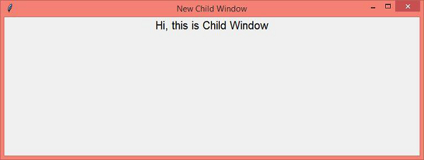 #Import tkinter library from tkinter import * from tkinter import ttk #Create an instance of tkinter frame win = Tk() #Set the geometry and title of tkinter Main window win.geometry("750x250") win.title("Main Window") #Create a child window using Toplevel method child_w= Toplevel(win) child_w.geometry("750x250") child_w.title("New Child Window") #Create Label in Mainwindow and Childwindow label_main= Label(win, text="Hi, this is Main window", font=('Helvetica 15')) label_main.pack(pady=20) label_child= Label(child_w, text= "Hi, this is Child Window", font=('Helvetica 15')) label_child.pack() win.mainloop()