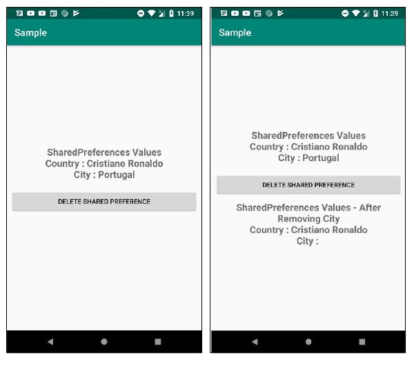 City : " + city); button.setOnClickListener(new View.OnClickListener() { @Override public void onClick(View view) { editor.remove(getResources().getString(R.string.sharedPref_key_country)); editor.apply(); String countryNow = sharedPreferences.getString(getResources().getString(R.string.sharedPre f_key_player), ""); String cityNow = sharedPreferences.getString(getResources().getString(R.string.sharedPre f_key_country), ""); tvAfterDelete.setText("SharedPreferences Values - After Removing City