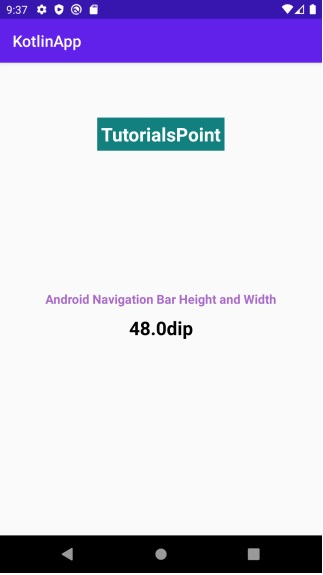 <?xml version="1.0" encoding="utf-8"?> <RelativeLayout xmlns:android="http://schemas.android.com/apk/res/android" xmlns:tools="http://schemas.android.com/tools" android:layout_width="match_parent" android:layout_height="match_parent" tools:context=".MainActivity"> <TextView android:layout_width="wrap_content" android:layout_height="wrap_content" android:layout_centerHorizontal="true" android:layout_marginTop="70dp" android:background="#008080" android:padding="5dp" android:text="TutorialsPoint" android:textColor="#fff" android:textSize="24sp" android:textStyle="bold" /> <TextView android:id="@+id/text" android:layout_width="wrap_content" android:layout_height="wrap_content" android:layout_centerInParent="true" android:text="Android Navigation Bar Height and Width" android:textColor="@android:color/holo_purple" android:textSize="16sp" android:textStyle="bold" /> <TextView android:textColor="@android:color/background_dark" android:id="@+id/textView" android:layout_width="wrap_content" android:layout_height="wrap_content" android:layout_below="@+id/text" android:layout_centerInParent="true" android:layout_marginTop="10dp" android:textSize="24sp" android:textStyle="bold" /> </RelativeLayout>