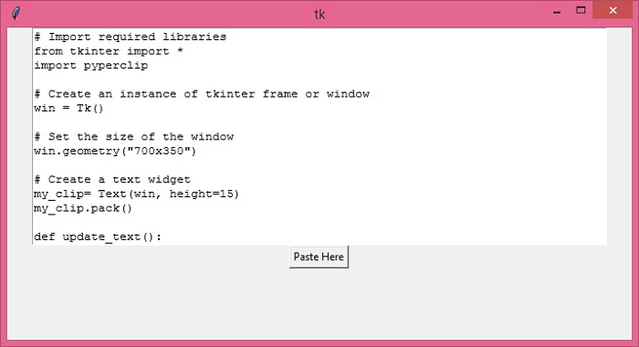 如果你執行上述程式碼段,它將顯示一個帶有按鈕和文字編輯器的視窗,其中貼上並顯示了複製的文字。