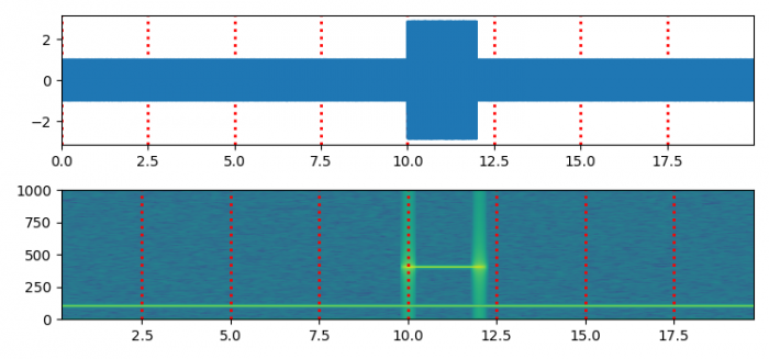 import matplotlib.pyplot as plt import numpy as np plt.rcParams["figure.figsize"] = [7.50, 3.50] plt.rcParams["figure.autolayout"] = True dt = 0.0005 t = np.arange(0.0, 20.0, dt) s1 = np.sin(2 * np.pi * 100 * t) s2 = 2 * np.sin(2 * np.pi * 400 * t) s2[t <= 10] = s2[12 <= t] = 0 nse = 0.01 * np.random.random(size=len(t)) x = s1 + s2 + nse NFFT = 1024 Fs = int(1.0 / dt) fig, (ax1, ax2) = plt.subplots(nrows=2) ax1.plot(t, x) ax1.grid(axis="x", ls="dotted", lw=2, color="red") ax1.margins(x=0) Pxx, freqs, bins, im = ax2.specgram(x, NFFT=NFFT, Fs=Fs, noverlap=900) ax2.grid(axis="x", ls="dotted", lw=2, color="red") plt.show()