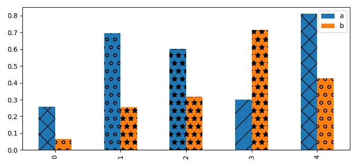 import numpy as np import pandas as pd from matplotlib import pyplot as plt plt.rcParams["figure.figsize"] = [7.50, 3.50] plt.rcParams["figure.autolayout"] = True df = pd.DataFrame(np.random.rand(5, 2), columns=['a', 'b']) ax = plt.figure().add_subplot(111) bars = df.plot(ax=ax, kind='bar') hatches = ["*", "/", "o", "x"] for patch in bars.patches: patch.set_hatch(hatches[np.random.randint(10)%len(hatches)]) plt.show()