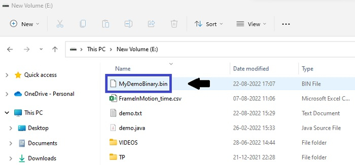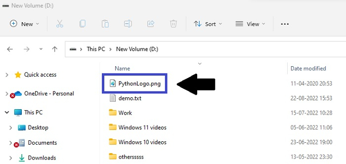 假設我們有一個二進位制檔案。我們可以使用 `read()` 方法讀取它。首先,我們將使用 `open()` 方法的 `rb` 模式開啟二進位制檔案。我們在 D 盤上有以下原始檔: