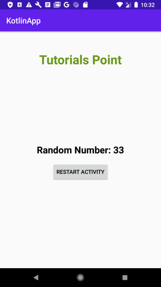 <?xml version="1.0" encoding="utf-8"?> <RelativeLayout xmlns:android="http://schemas.android.com/apk/res/android" xmlns:tools="http://schemas.android.com/tools" android:layout_width="match_parent" android:layout_height="match_parent" tools:context=".MainActivity"> <TextView android:layout_width="wrap_content" android:layout_height="wrap_content" android:layout_centerHorizontal="true" android:layout_marginTop="50dp" android:text="Tutorials Point" android:textAlignment="center" android:textColor="@android:color/holo_green_dark" android:textSize="32sp" android:textStyle="bold" /> <TextView android:id="@+id/textView" android:layout_width="wrap_content" android:layout_height="wrap_content" android:layout_centerInParent="true" android:textColor="@android:color/background_dark" android:textSize="24sp" android:textStyle="bold" /> <Button android:id="@+id/button" android:layout_width="wrap_content" android:layout_height="wrap_content" android:layout_below="@id/textView" android:layout_centerInParent="true" android:layout_marginTop="16sp" android:text="Restart Activity" android:textColor="@android:color/background_dark" /> </RelativeLayout>
