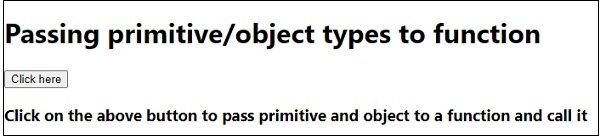 <!DOCTYPE html> <html lang="en"> <head> <meta charset="UTF-8" /> <meta name="viewport" content="width=device-width, initial-scale=1.0" /> <title>Document</title> <style> body { font-family: "Segoe UI", Tahoma, Geneva, Verdana, sans-serif; } .result { font-size: 18px; font-weight: 500; color: blueviolet; } </style> </head> <body> <h1>Passing primitive/object types to function</h1> <div class="result"></div> <div class="result"></div> <button class="Btn">Click here</button> <h3>Click on the above button to pass primitive and object to a function and call it</h3> <script> let BtnEle = document.querySelector(".Btn"); let resEle = document.querySelector(".result"); let person = { name: "Rohan", age: 12, city: "Delhi" }; function printObj(obj) { resEle.innerHTML = "Name = " + obj.name + "<br>"; resEle.innerHTML += "age = " + obj.age + "<br>"; resEle.innerHTML += "city = " + obj.city + "<br>"; } function printPrimitive(prim) { resEle.innerHTML += prim; } BtnEle.addEventListener("click", () => { printObj(person); printPrimitive(22); }); </script> </body> </html>