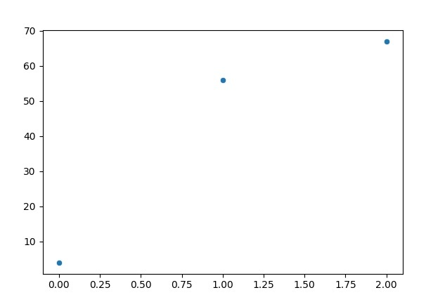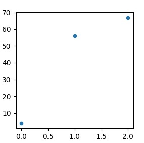 import seaborn as sns import matplotlib.pyplot as plt # Create a figure with a specific size plt.figure(figsize=(3, 3)) y = [4,56,67] # Create a plot using Seaborn sns.scatterplot(y) # Set the figure size using rcParams plt.rcParams["figure.figsize"] = (600, 400) # Create a plot using Seaborn sns.scatterplot(y=y) plt.show()