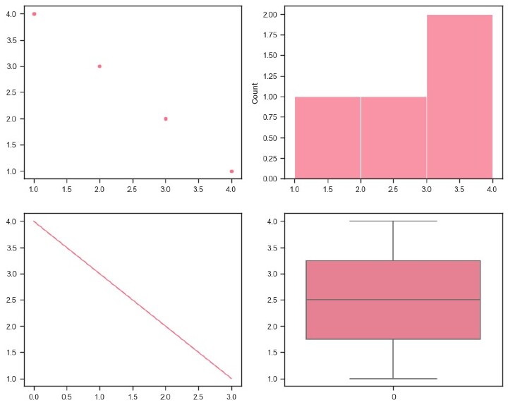 # Create a figure with multiple subplots fig, axes = plt.subplots(2, 2, figsize=(10, 8)) # Create plots using Seaborn sns.scatterplot(x=x, y=y, ax=axes[0, 0]) sns.histplot(data=x, ax=axes[0, 1]) sns.lineplot(data=y, ax=axes[1, 0]) sns.boxplot(data=y, ax=axes[1, 1]) plt.show()