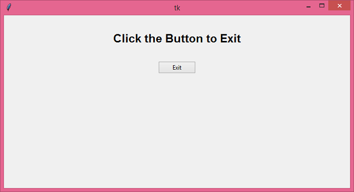 #Import the required libraries from tkinter import * from tkinter import ttk #Create an instance of Tkinter Frame win = Tk() #Set the geometry of Tkinter Frame win.geometry("700x350") #Define a function for exit def exit_program(): win.destroy() #Add a canvas widget canvas = Canvas(win, width= 350) #Add a Label widget in the Canvas label = Label(canvas, text= "Click the Button to Exit", font= ('Helvetica 17 bold')) label.pack(pady= 30) #Create a button in canvas widget ttk.Button(canvas, text= "Exit", command= exit_program).pack() canvas.pack() win.mainloop()