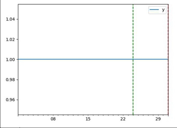 使用 axvline(),在座標軸上新增一條垂直線,其中顏色為綠色,linestyle="dashed"。