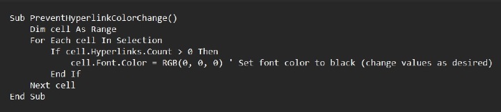 VBA 程式碼迭代指定範圍內的每個單元格,將包含超連結的單元格的字型顏色更改為黑色。要更改字型顏色,請更改程式碼中的 RGB 值。