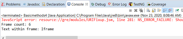 接下來,我們使用 return 關鍵字返回 Selenium 命令的值。我們必須藉助 Javascript 中的 window.length 命令來計算頁面中的框架數量。