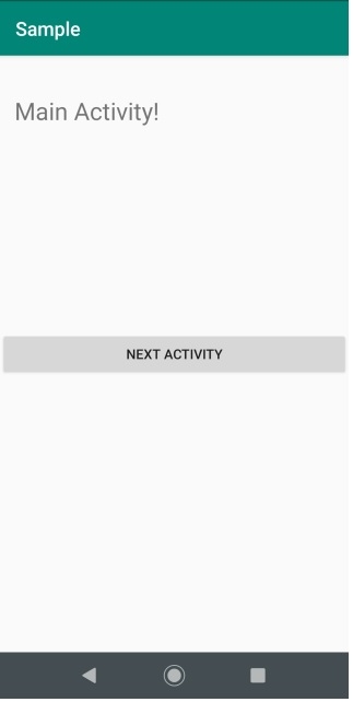 <?xml version="1.0" encoding="utf-8"?> <RelativeLayout xmlns:android="http://schemas.android.com/apk/res/android" xmlns:tools="http://schemas.android.com/tools" android:layout_width="match_parent" android:layout_height="match_parent" tools:context=".MainActivity"> <TextView android:layout_width="match_parent" android:layout_height="wrap_content" android:text="Main Activity!" android:layout_marginTop="25sp" android:textSize="25dp" android:padding="15dp" /> <Button android:id="@+id/button" android:layout_width="match_parent" android:layout_height="wrap_content" android:layout_centerVertical="true" android:text="Next Activity" /> </RelativeLayout>