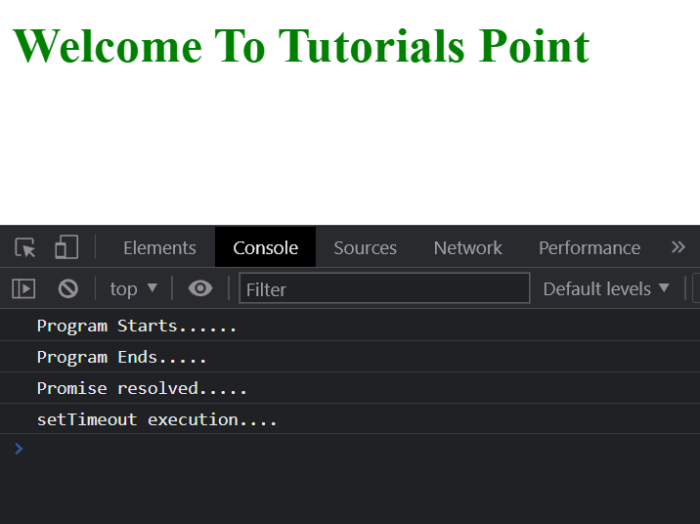 <!DOCTYPE html> <html lang="en"> <head> <title>Asynchronous Code</title> </head> <body> <h1 style="color: green;"> Welcome To Tutorials Point </h1> <script> console.log("Program Starts......"); setTimeout(() => { console.log("setTimeout execution...."); }, 0); new Promise((resolve, reject) => { resolve("Promise resolved....."); }) .then((res) => console.log(res)) .catch((error) => console.log(error)); console.log("Program Ends....."); </script> </body> </html>