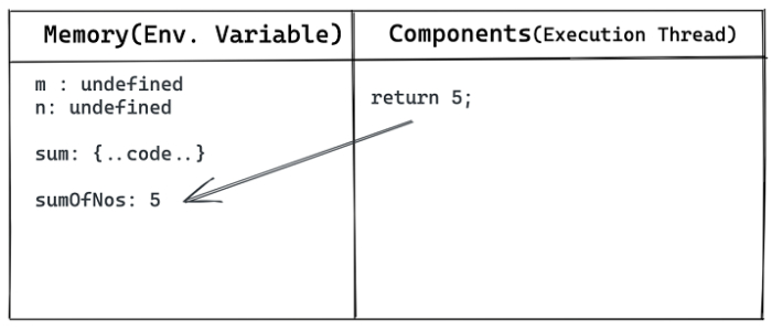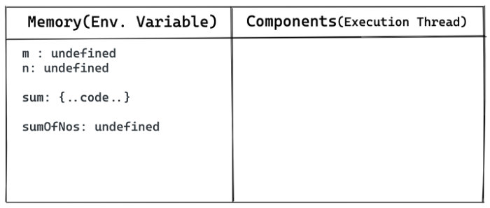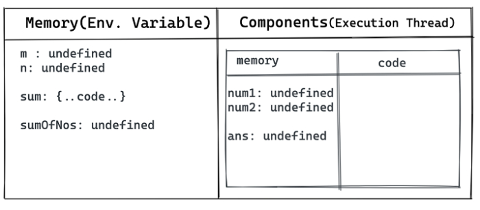 一旦值被初始化,sum() 函式就會被呼叫,它接收兩個輸入並返回這兩個數字的和。所有這些都在執行上下文中發生。它包含兩部分:記憶體和用於程式碼執行的元件階段。