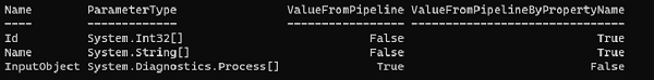 (Get-Command Stop-Process).ParameterSets.parameters ` | where{($_.ValueFromPipelineByPropertyName -eq 'True') -or ($_.ValueFromPipeline -eq "True")} ` | Select Name,ParameterType,ValueFromPipeline, ValueFromPipelineByPropertyName