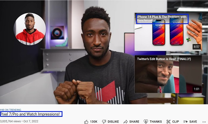 Marques Brownlee 透過結束螢幕(如此處所示)引導他的觀眾從一個影片到另一個主題類似的影片 -