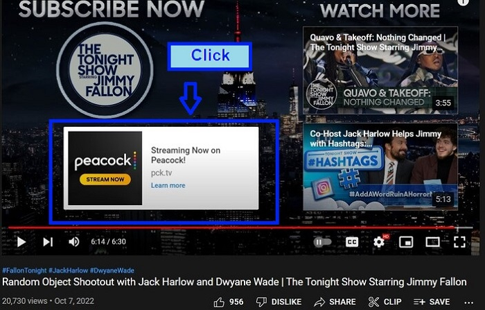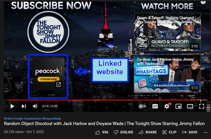 您還可以連結另一個 YouTube 頻道。連結的結束螢幕允許您新增指向您自己網站的連結。YouTube 也提供了一個設定關聯網站的過程。此外,在使用 YouTube 設定您自己的網站後,您也可以將觀看者引導到網站上。它可以透過重定向來連結。您還可以將您的觀看者引導到您的新 YouTube 頻道,從而增加該頻道的訂閱者。吉米·法倫的《今夜秀》在結束螢幕上推廣了孔雀網站。