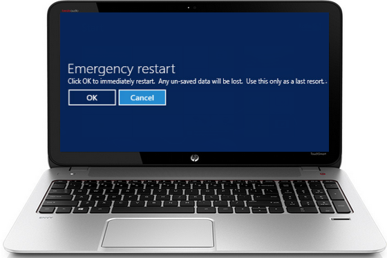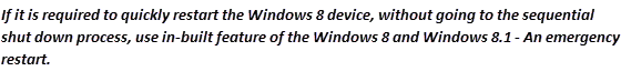 在 Windows 8 和 Windows 8.1 中,緊急重啟功能使用 Windows 8 平板電腦、筆記型電腦或桌上型電腦的硬體電源按鈕進行操作。但是,除非使用者遇到緊急情況,否則不建議使用此操作。