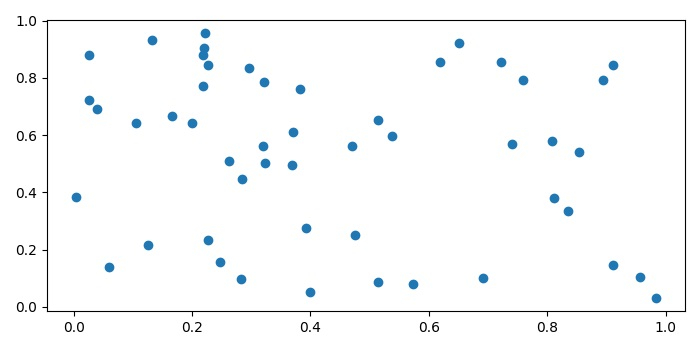 import numpy as np import matplotlib.pyplot as plt plt.rcParams["figure.figsize"] = [7.00, 3.50] plt.rcParams["figure.autolayout"] = True N = 50 x = np.random.rand(N) y = np.random.rand(N) plt.scatter(x, y) plt.show()